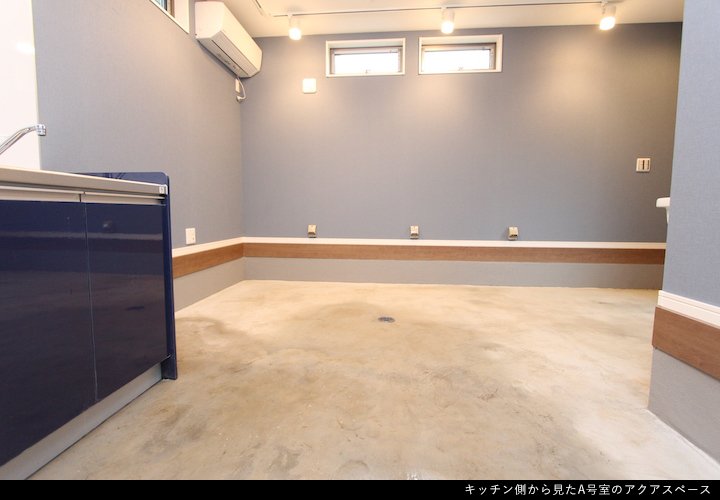 1階アクアスペースの床は土間仕上げになっています。写真は床を水洗いしたあとのもの。キッチンの手前が濡れているのがわかるかと思いますが、こんなふうに水を流しても全く問題ありません。水平につくっているので、水槽が傾くことはないですし、強度も十分なので、水をいっぱい入れた大型水槽を置いても問題ありません。