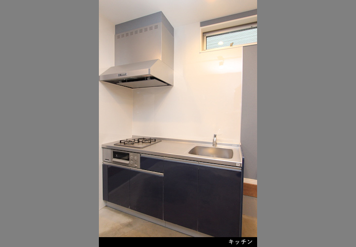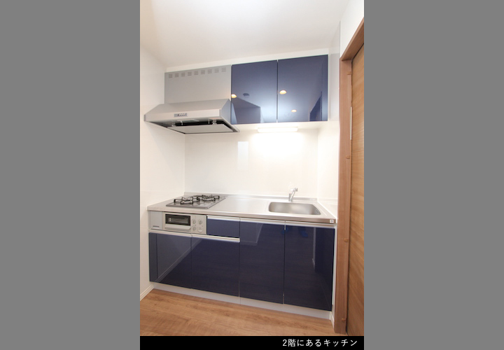 2階はキッチン、シャワートイレ、洗濯機置場、冷蔵庫置場となっています。食事は1階のアクアスペースか3階の洋室でとっていただくことを想定しています。