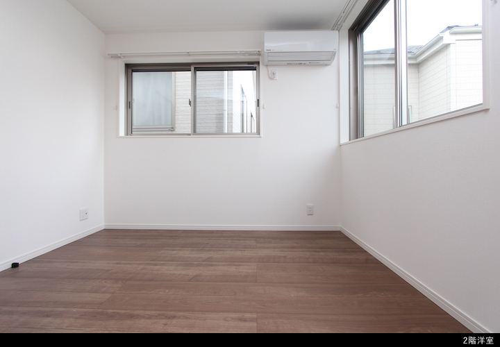 2階は寝室です。二面採光なので、明るい印象です。床はフローリングが敷いてあります。ここにパウダールームとバスルームが隣接し、廊下をはさんでトイレがあります。