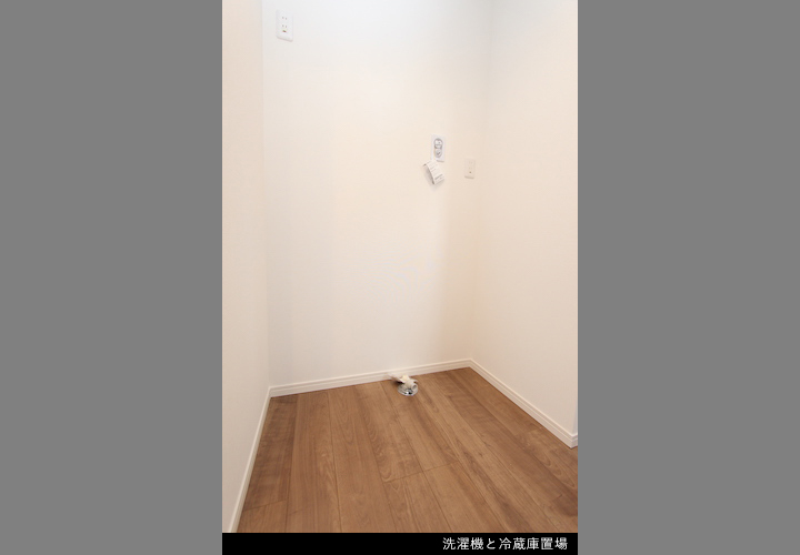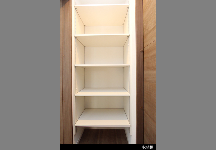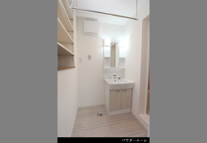 バスルームは追い焚き機能と浴室乾燥機がついています。パウダールームには下着やタオルをしまっておける棚と、室内物干しがあります。廊下の奥には収納棚があります。