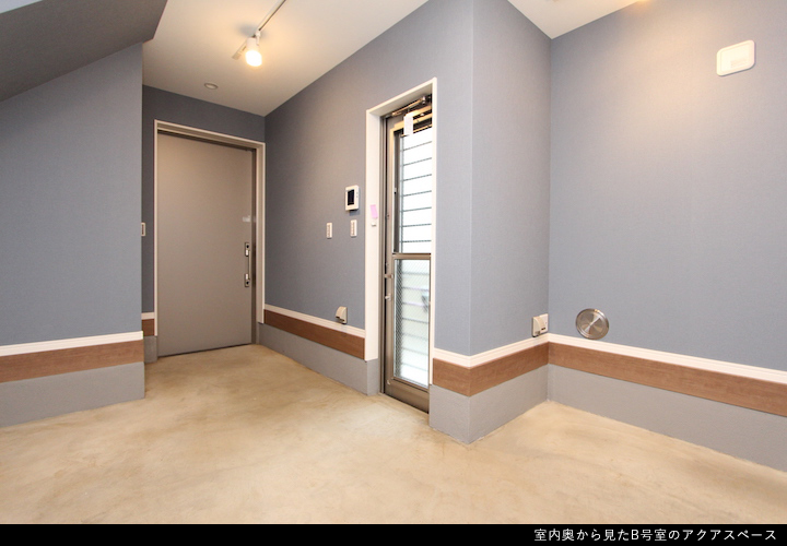 ペットのエサを保管(保冷)するための専用冷蔵庫を置けるようにしています。A号室のほうは背の高い冷蔵庫が置けます。B号室は上の写真のように階段下のスペースを活用しているので、あまり高いものは無理ですが、この場に限定する必要もないので、自由に設置してください。