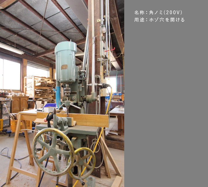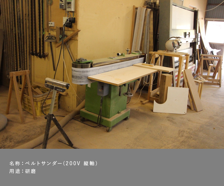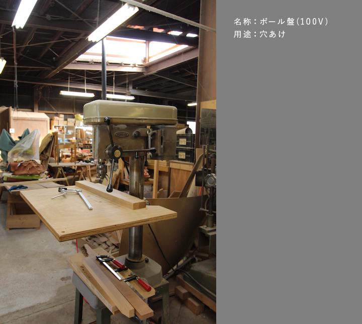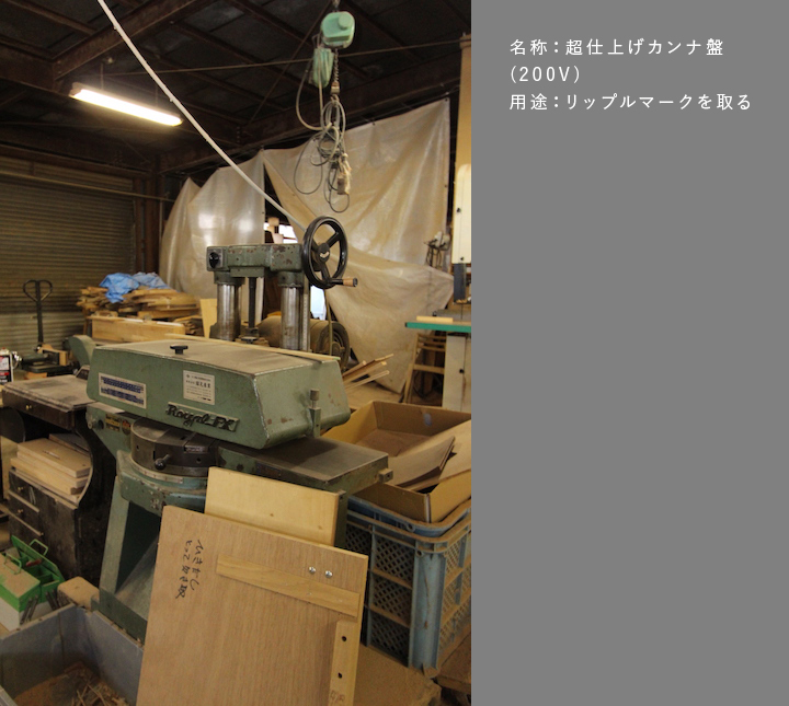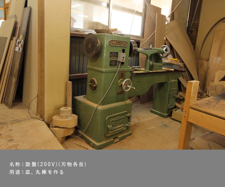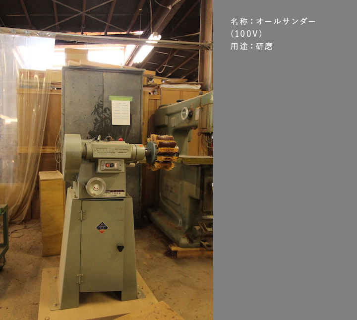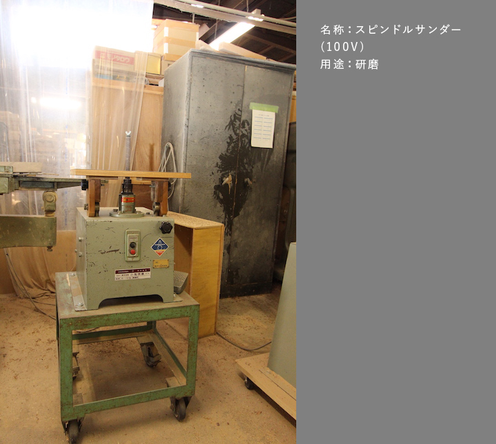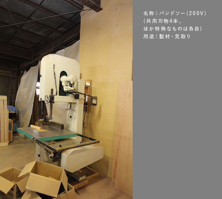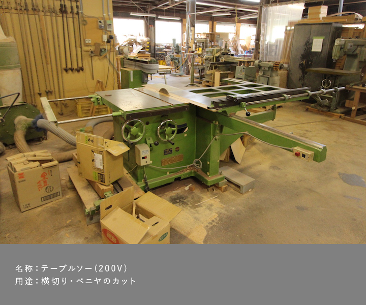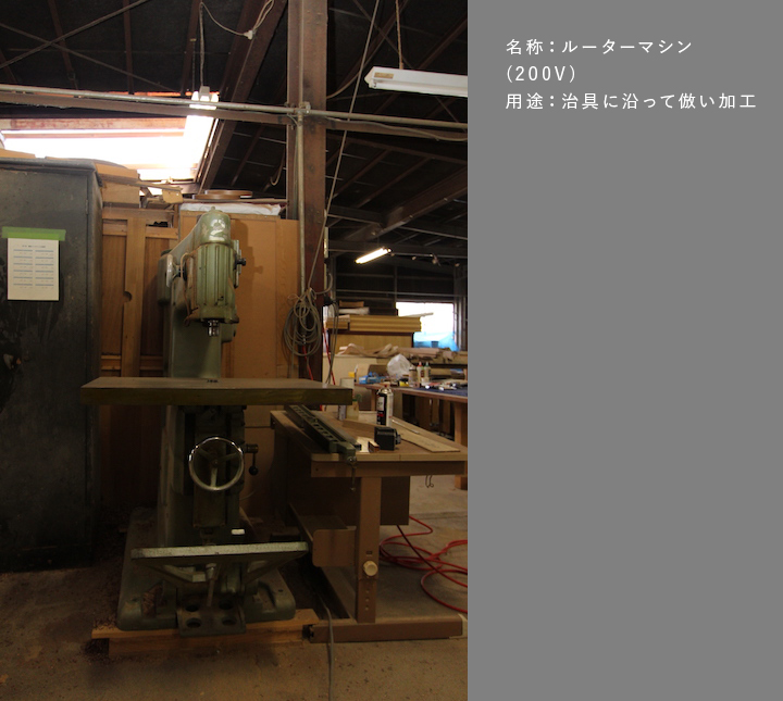 スライド形式でご紹介しているのは共用できる設備です。このほかに手押しカンバ盤(基準面を作る)、昇降盤(縦割り・溝突き・ホゾ取りなどに使う)、糸鋸(細かいくり抜きに使う)、面プレス(接着・組み立て)、コンプレッサー(タッカー、ダブルアクション、オービタルなどのエア工具の掃除に使う)などがあります。