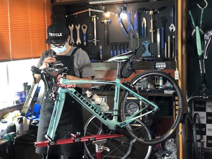 TRYCLEを経営する田渕君幸さんは元プロツアーレーサーで、自転車でアメリカ横断したこともあるベテランサイクリスト。