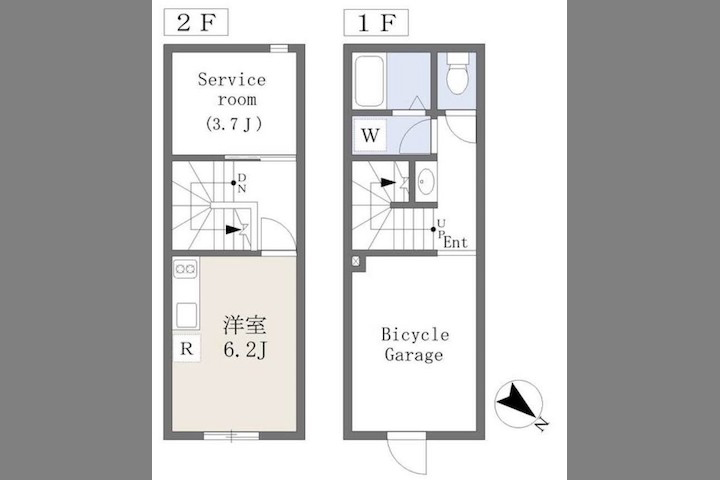3,4号室のタイプは2階建てで、2階がダイニングキッチンと洋室の2つに分かれています。
