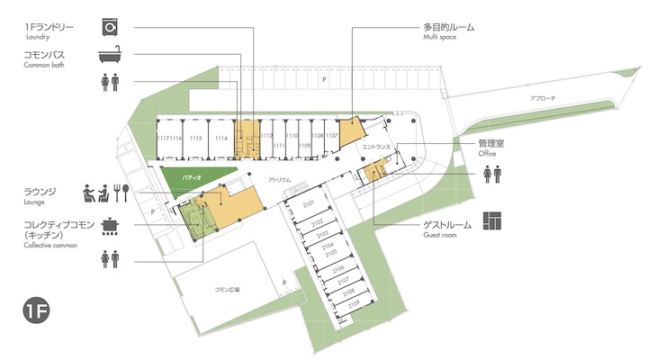 - 共用部分設備:コレクティブコモン・キッチン/ラウンジ/コモンバス/ランドリー/ゲストルーム/多目的ルーム/アトリウム/コモンルーム/コレクティブコモン/オートロック/メールボックス/宅配ボックス/ゴミ置場/駐車場(月額8,000~10,000円/税別)、バイク置場(月額1,000~3,000円/大きさによる/税別)、駐輪場(初回登録料500円/税別)、トランクスペース