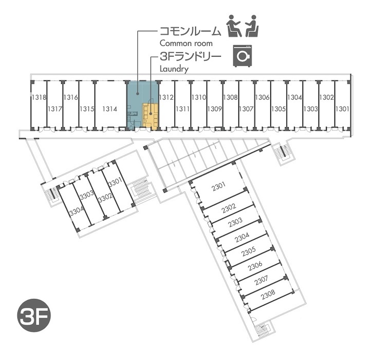 洗濯機置場も居室内にはなく、コモンスペース1Fと3Fにあるランドリーを利用することになります。