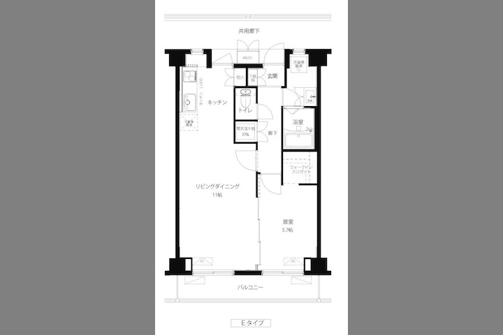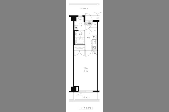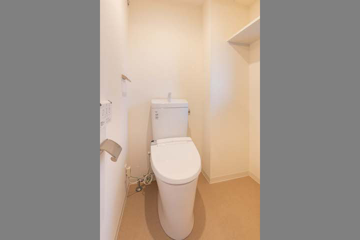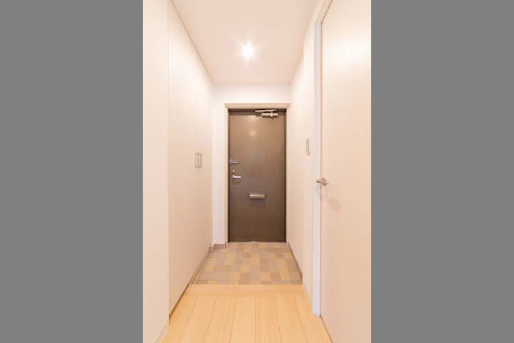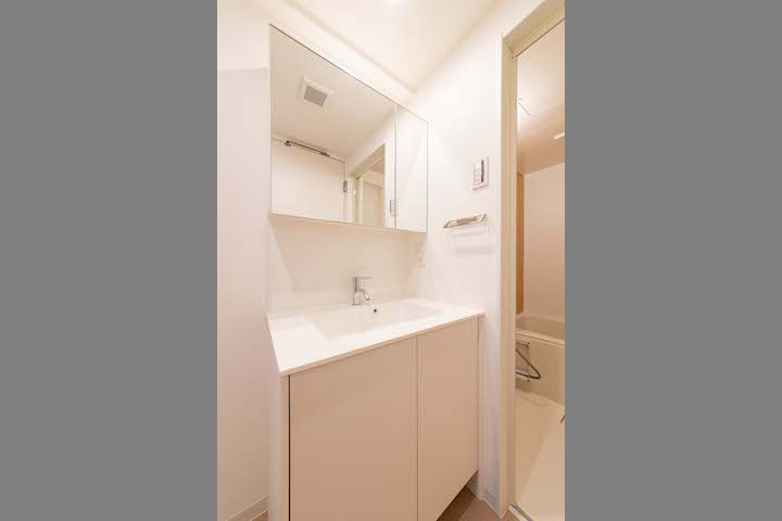 1Kタイプのお部屋には、バス・トイレが一緒になっていてサービスルームがあるタイプと、バス・トイレ別のタイプとがあります。ここではモデルルームになっている前者のタイプの写真をご覧いただきます(※バス・トイレ別のタイプは間取図のみ掲載します)。