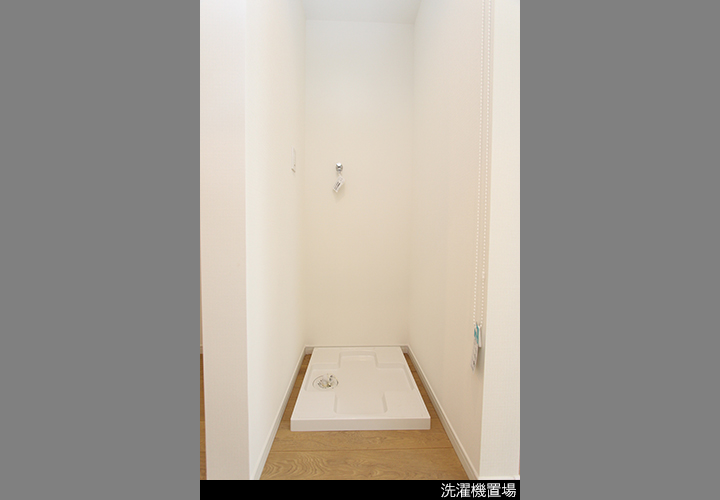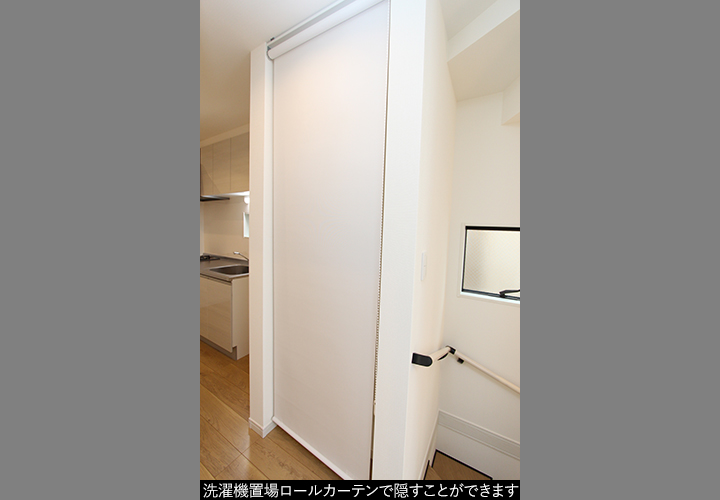 洗濯機置場は家事動線を考慮し、キッチンの脇に設けられています。生活感を極力出したくない方のためにロールスクリーンで見えなくすることもできるようになっています。