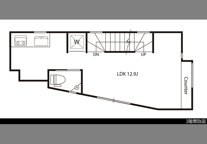 続いて2階をご案内します。前述の通り、2階はリビング・ダイニング・キッチンになっています。12.9畳ほどの広さがあり、窓が多いからなかなかの開放感。奥にはテレビなどが置けるカウンターが設けられています。