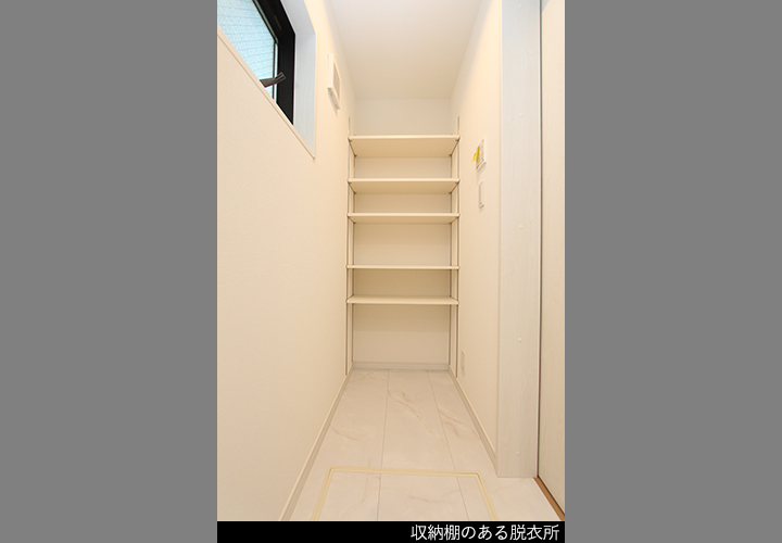 脱衣所には収納棚があり、ここに下着やタオルなどを置けて、とても便利。
