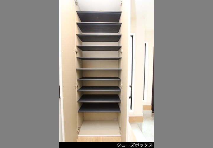 玄関から入って右側、階段前にシューズボックスが設置されていますが、これも天井までの高さがあるので収納量は豊富。シューズ以外のものを置くこともできますね。