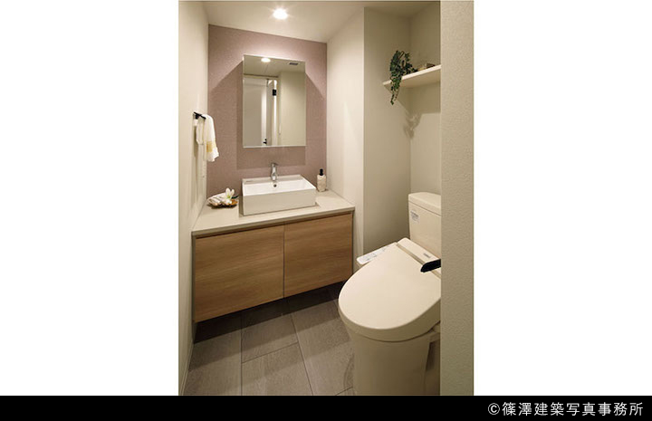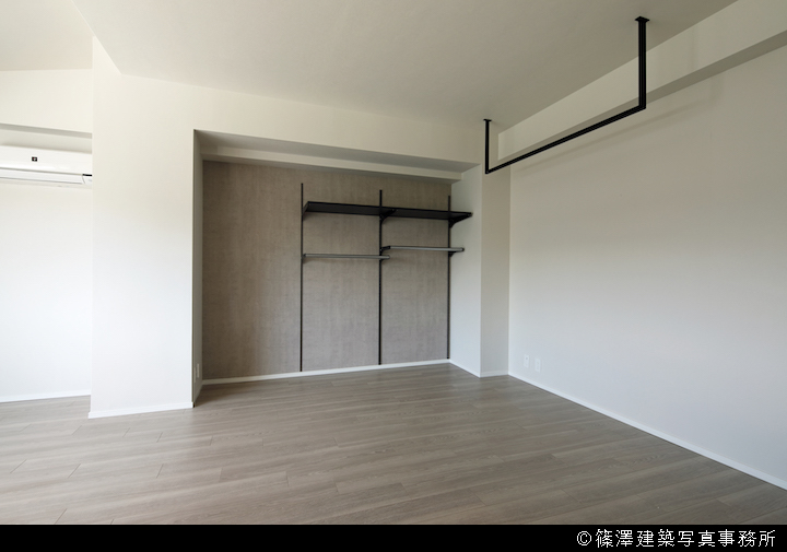 壁面の一部に、オープン棚が設置されていて、持ち物・衣類の整理はもちろん、おしゃれ小物をおいてアクセントをつけることもできます。