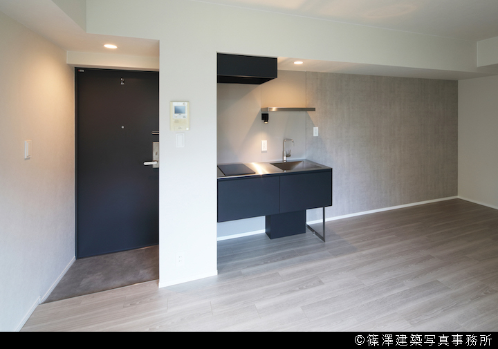 Eタイプは最上階に1室だけあるお部屋。ルーフバルコニーにつながる明るい対面キッチンを中心とした開放的なタイプで、ステンレス製のキッチンとグレーのアクセントクロスがスタイリッシュなスタジオタイプの居室です。