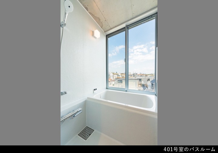 401号室は他室と異なり浴槽もあり、大きな窓がついているので開放感抜群(外からの目が気になる方はブラインドが設置されているのでご安心ください)。