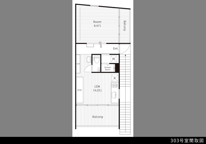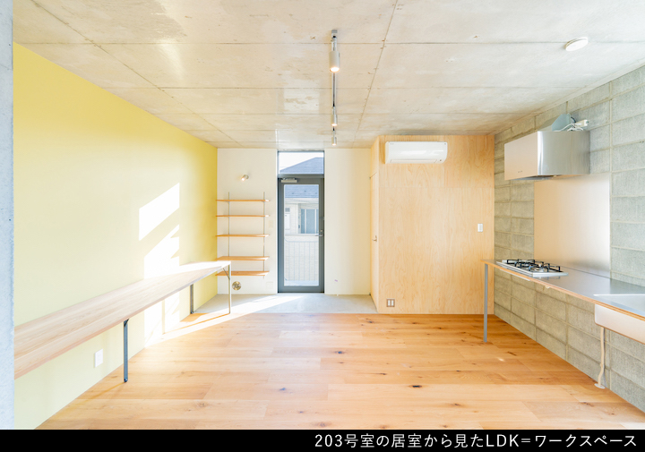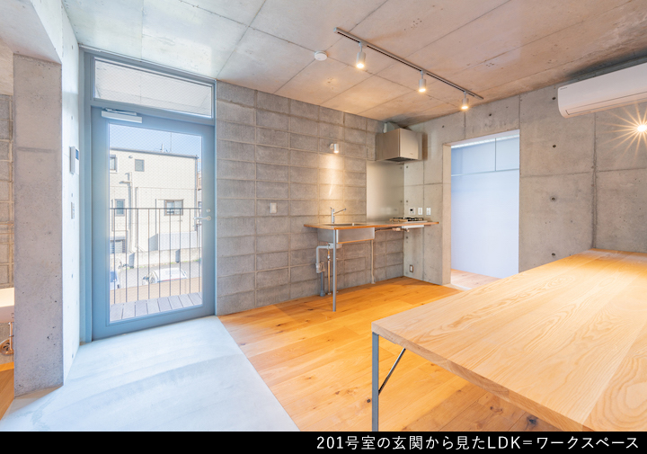 ここまで202号室と102号室を例にとって、職住一体型住居として優れた点をご紹介してまいりましたが、「ワク賃047」は8つの貸室すべて間取りが違うという特長があります。