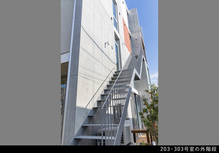 「ワク賃047」の貸室は全部で8室ありますが、そのうち4室はエントランス内の共用階段を使わず、外階段を利用して自由に出入りできるようになっています。