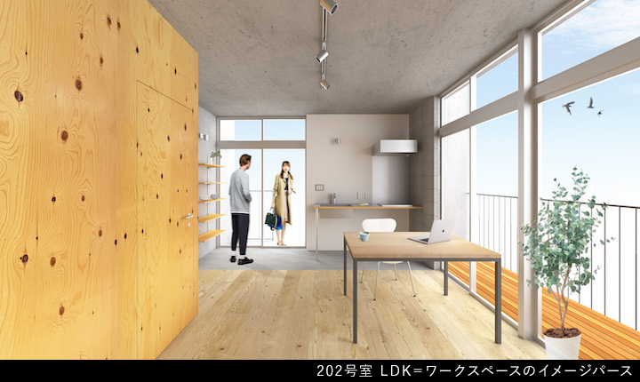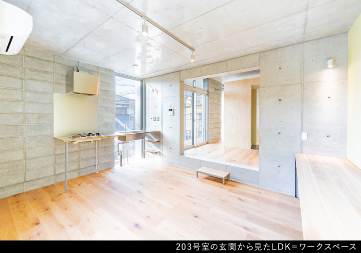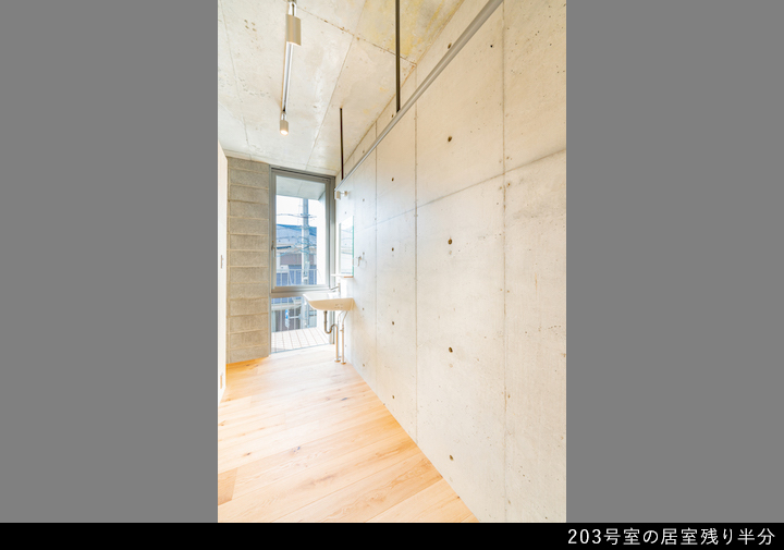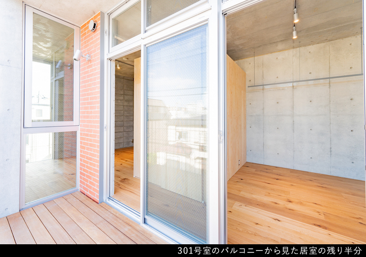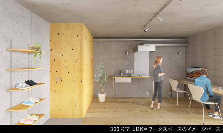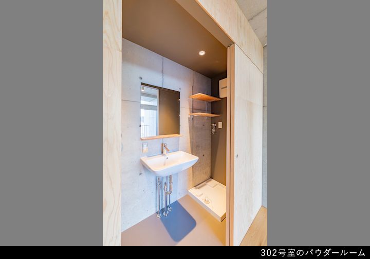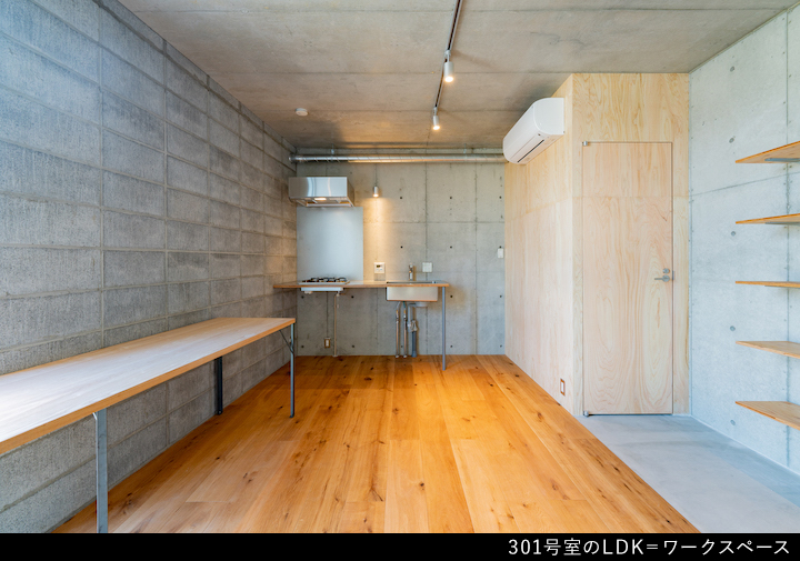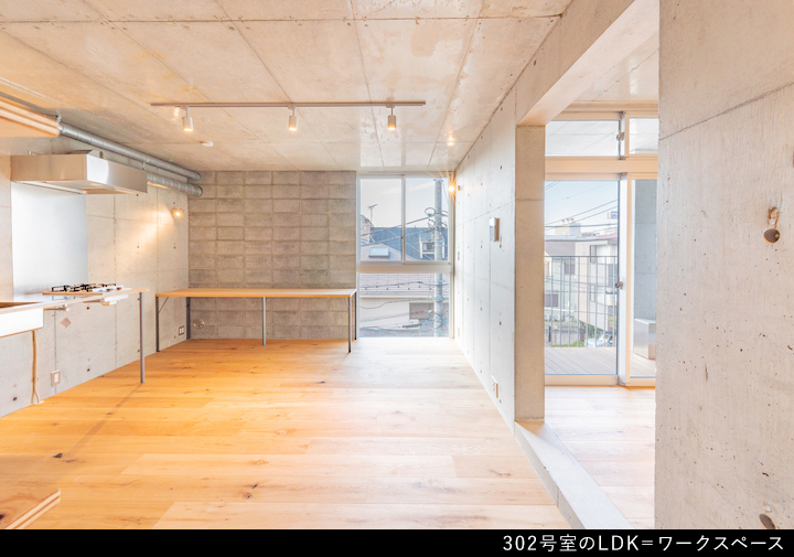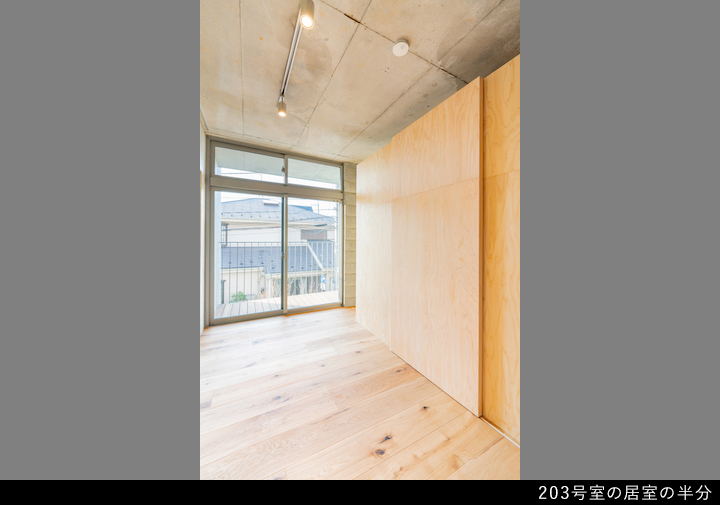 全体の中央に水回りが組み込まれた木製ボックスがあり、その奥にLDKがあります。他室はLDKをワークスペースとしていただくのがベストですが、303号室に限っては、舞台のような居室のほうをワークスペースにして、広いバルコニーのついたLDKを居住スペースとする、という使い方も良さそうです。