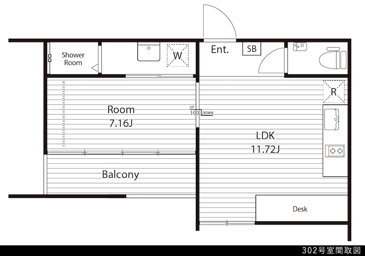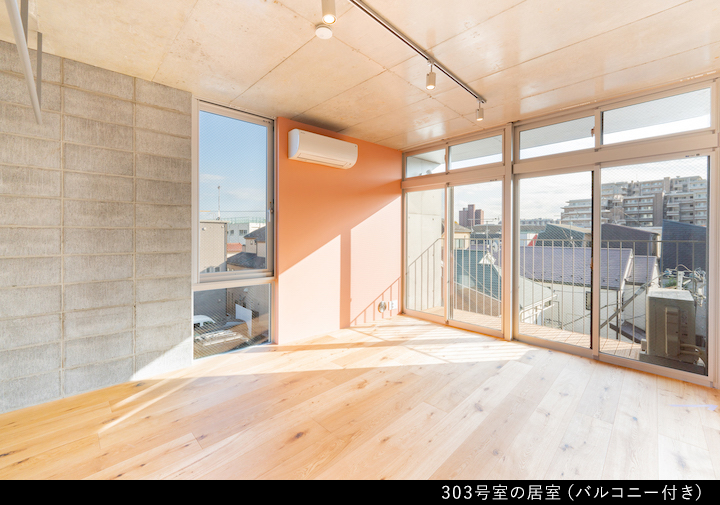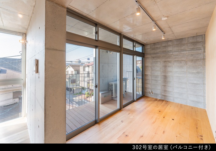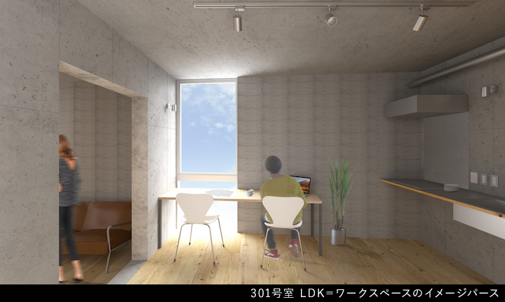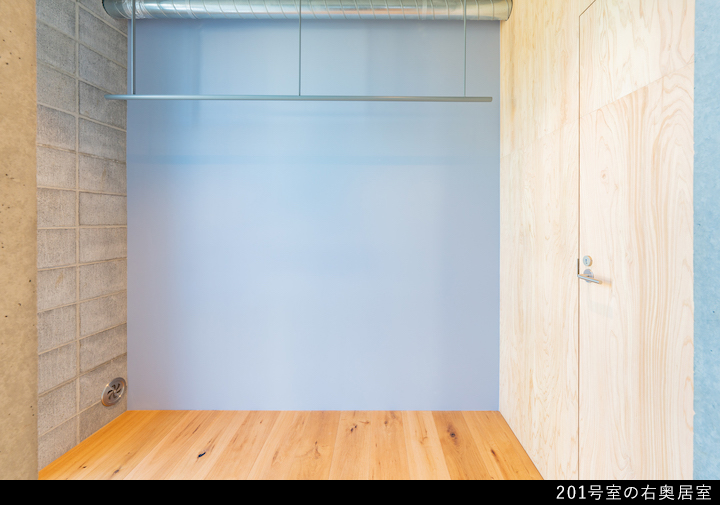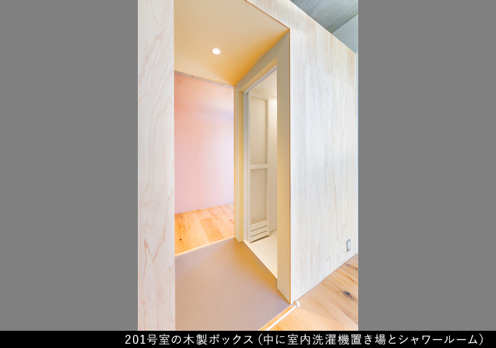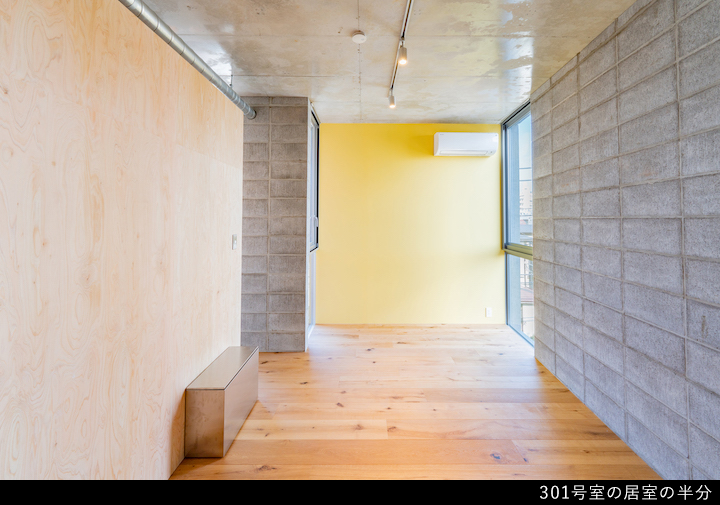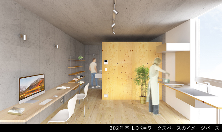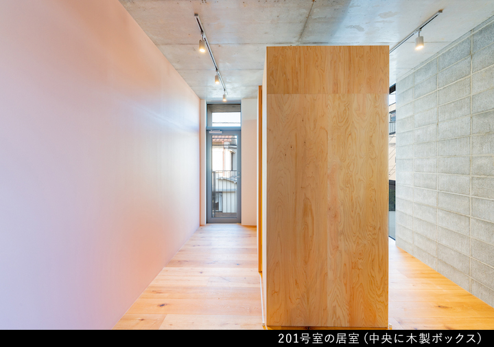 全体の中央に水回りが組み込まれた木製ボックスがあり、その奥にLDKがあります。他室はLDKをワークスペースとしていただくのがベストですが、303号室に限っては、舞台のような居室のほうをワークスペースにして、広いバルコニーのついたLDKを居住スペースとする、という使い方も良さそうです。