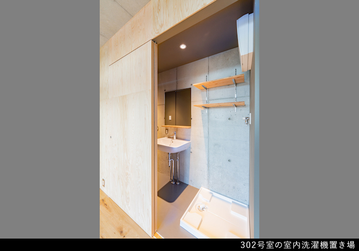 202号室木製ボックス内の洗面台と洗濯機置き場。