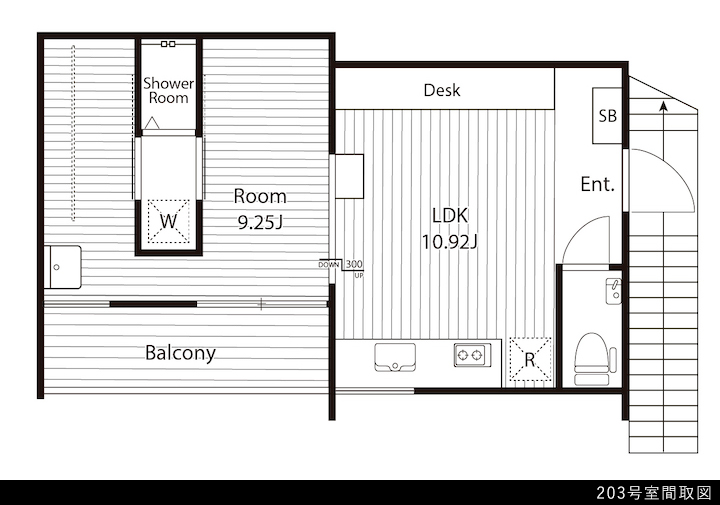 203号室は先にご紹介した202号室と同様、外階段がついているので、小商いをしながら暮らすにはピッタリのお部屋です。