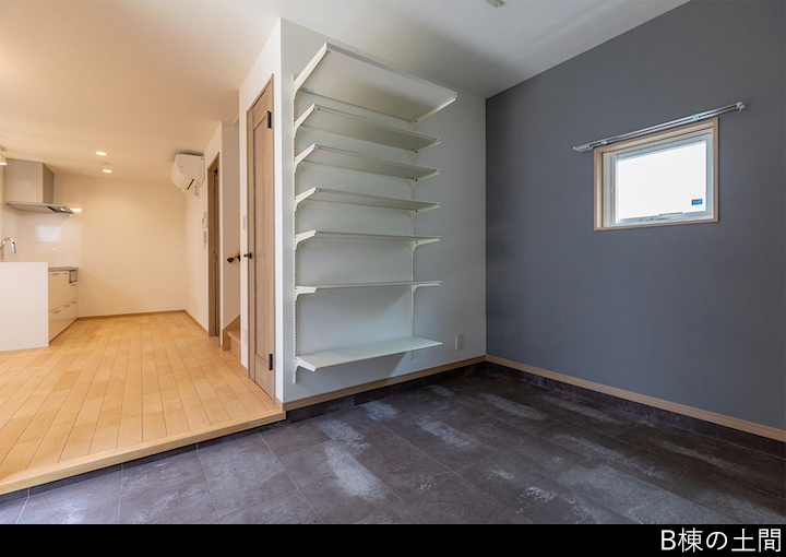 土間と聞くと夏暑く、冬寒いイメージがありますが、Nagaya Cross は高断熱・高気密賃貸住宅のため、LDK に続く土間空間も夏冬快適な場所です。